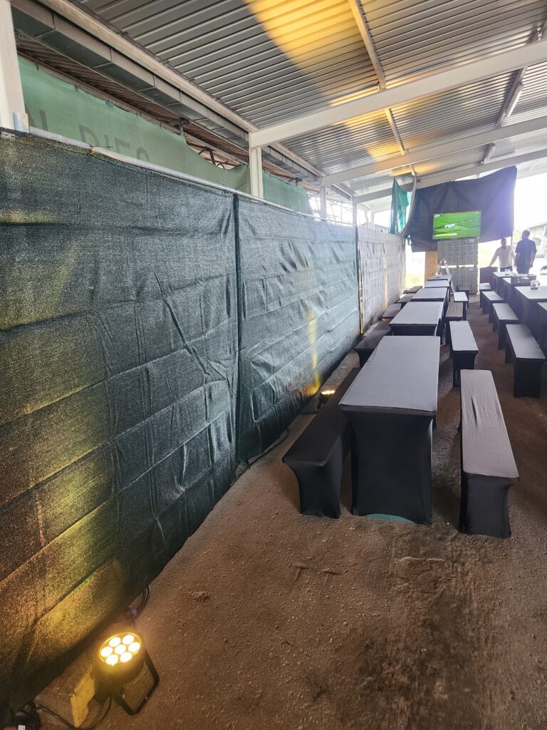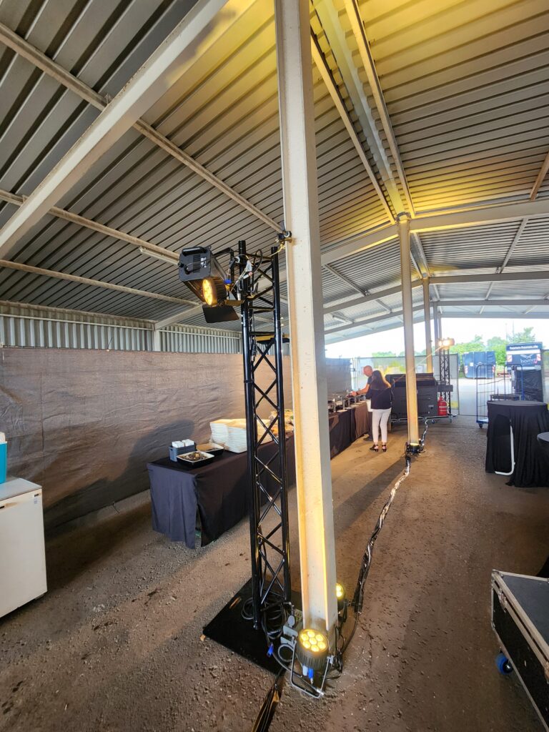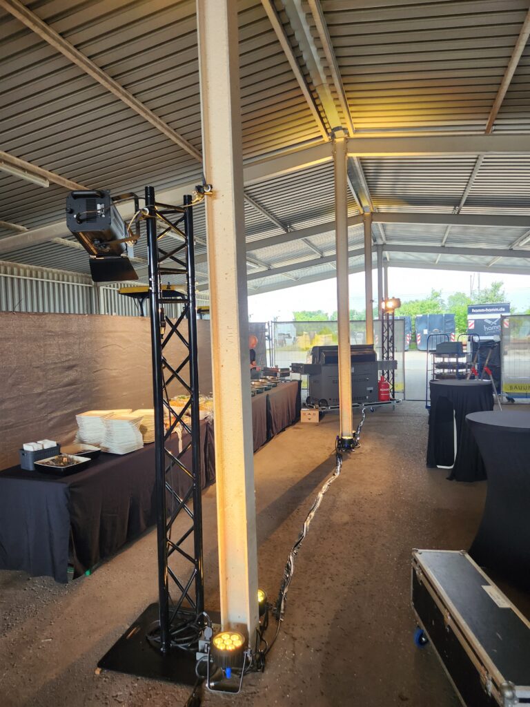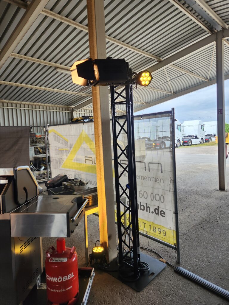 Am jetzigen Wochenende durfte ich für die Betriebsfeier des Bauunternehmens Aumann für ein wenig Licht sorgen. Zum Einsatz kamen 16 Eurolight 4C-7 Led Scheinwerfer, die die Fahrzeughalle in ein schönes gelb tauchten. Zu dem wurden auch zwei Traversentürme mit je einem 1 Kw Bühnenscheinwerfer gestellt, um das Buffet ins richtige Licht zu rücken.